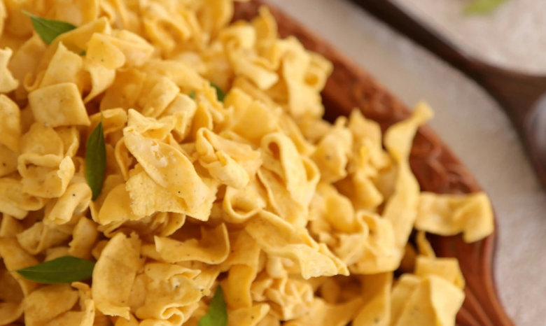 Kara sev is a spicy crispy snack perfect for a hot cup of chai on a rainy day. It is made using gram flour, rice flour, pepper, chili powder, garlic, and salt.