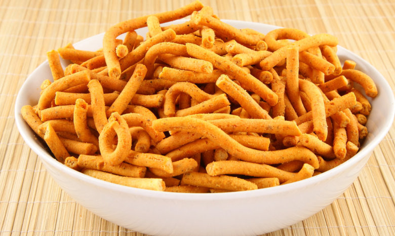Kara sev is a spicy crispy snack perfect for a hot cup of chai on a rainy day. It is made using gram flour, rice flour, pepper, chili powder, garlic, and salt.